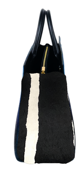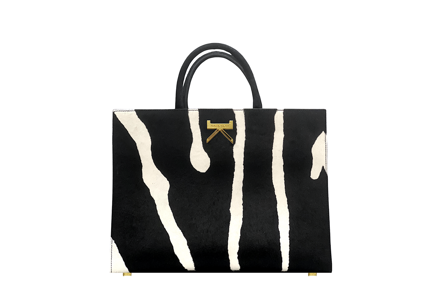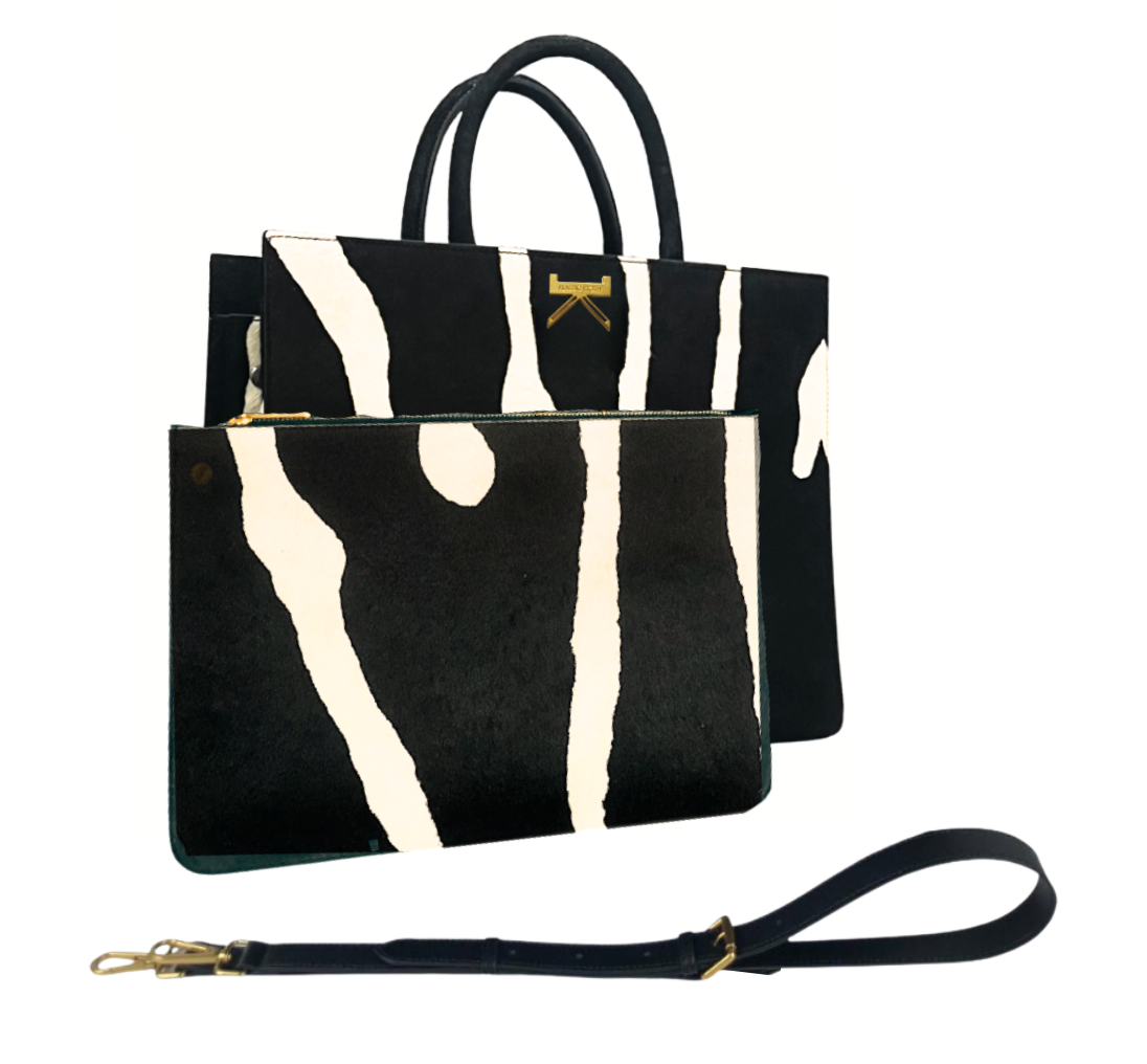 BOUID 34 is the medium, every day size, of the tote trio. Structured in silhouette and adorned with our signature antique gold 'K' hardware. The abstract zebra-printed calf hair, is hand printed by our official team of technicians.
